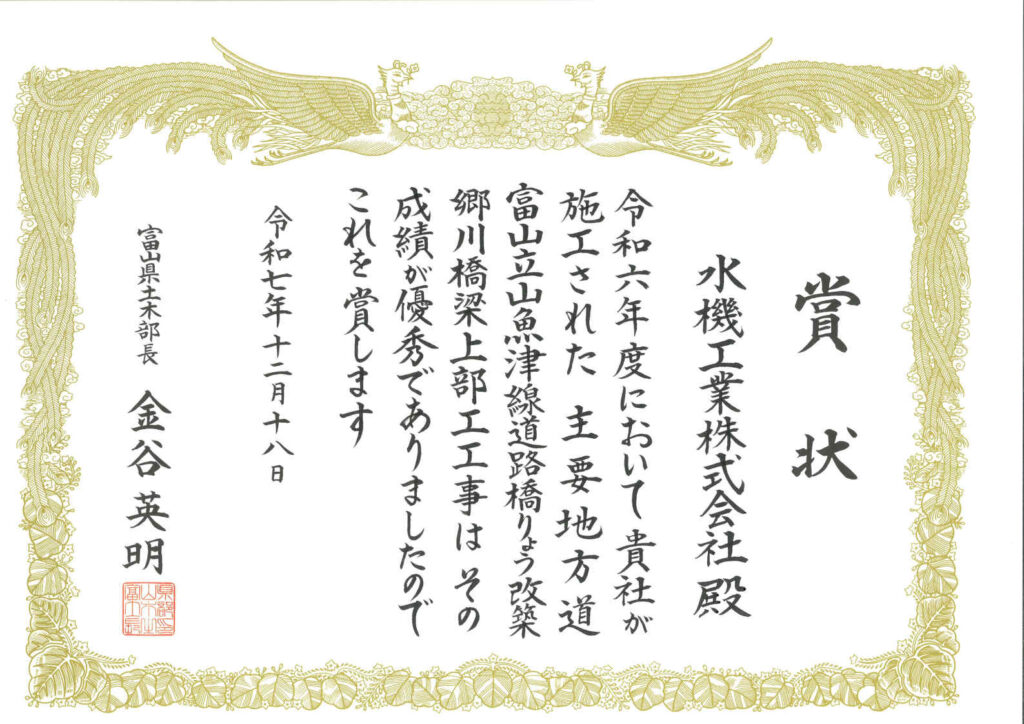 令和6年度に完工した、富山県新川土木センター発注の『富山立山魚津線道路橋りょう改築郷川橋梁上部工工事』が、富山県優良工事表彰検討会様より優良工事『土木部長賞』の評価をいただきました。
