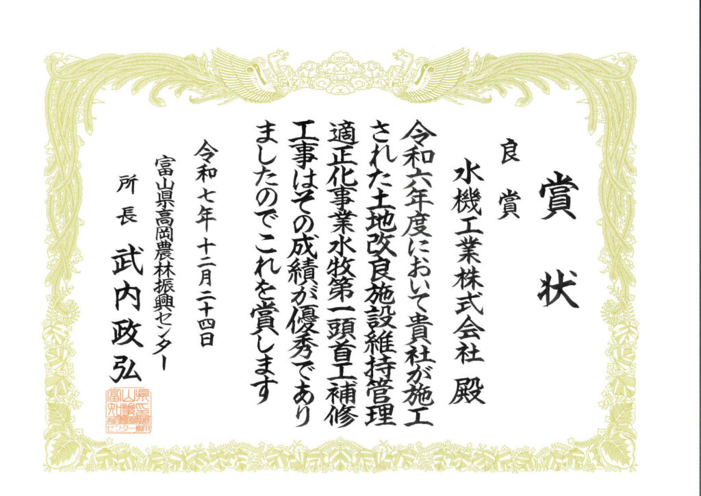令和6年度に小矢部市土地改良区より受注し、弊社が施工した『土地改良施設維持管理適正化事業 水牧第1頭首工補修工事』が、高岡農林振興センター所長表彰にて優良工事『良賞』の評価をいただきました。
